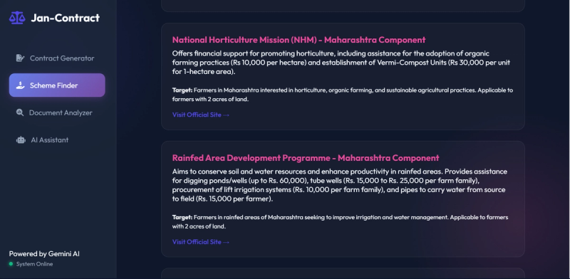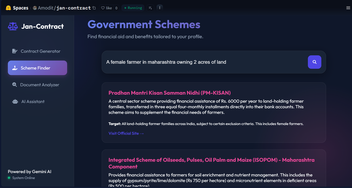 - Government Scheme Finder - Intelligently searches and recommends relevant government welfare schemes based on user profiles using web search APIs