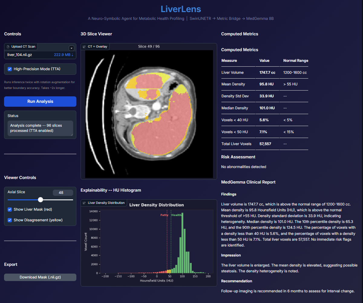 A deterministic analysis layer written in Python and NumPy processes the segmentation mask to compute mathematically exact metrics. Liver volume is calculated by counting mask voxels and applying voxel spacing derived from the NIfTI affine matrix. Hounsfield Unit statistics (mean, median, standard deviation) are computed within the mask, along with the fraction of voxels below clinically relevant thresholds for steatosis. This stage acts as a firewall ensuring all quantitative outputs are derived algorithmically rather than inferred by an LLM.